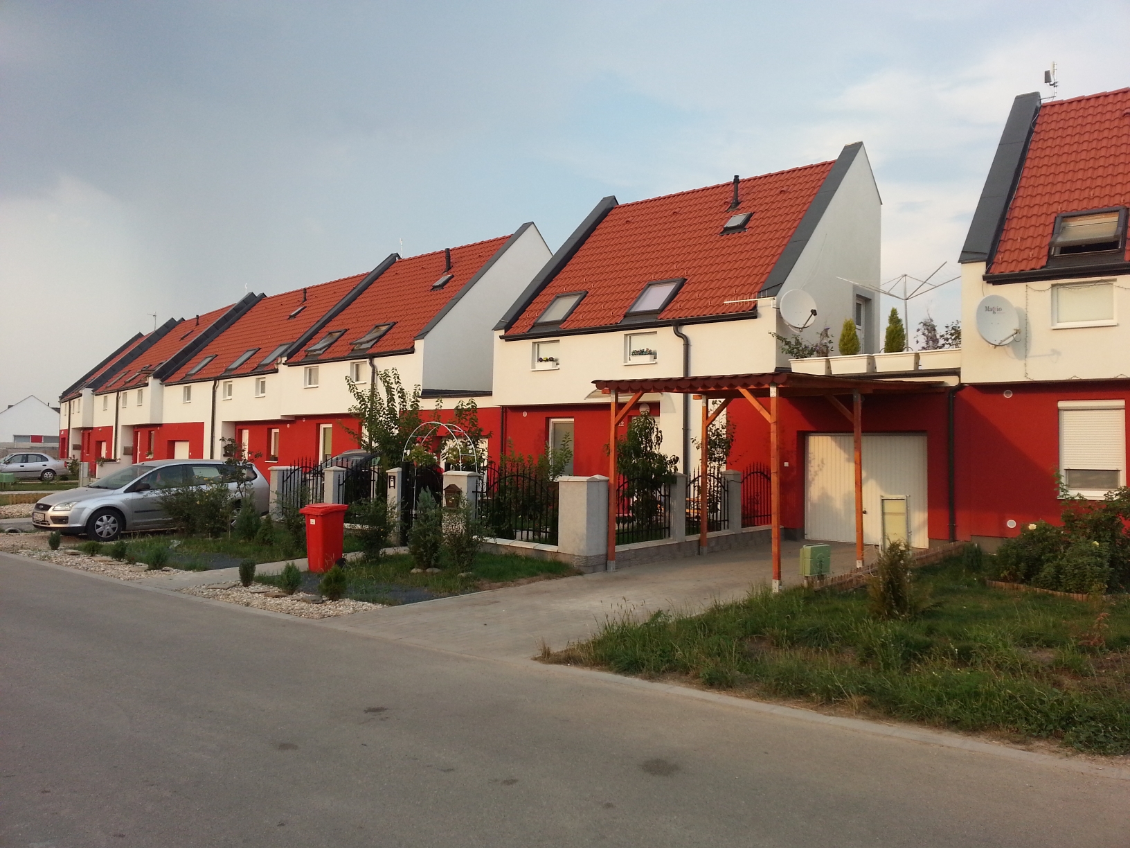 A szomszédos épületek mind nyeregtetősek. Párkányvonaluk jellemzően talajszinttől mért cca. +4,5 m-en van. A tervezett beépítés illeszkedik a tervezett utcaképhez, amely utcával párhuzamos tetőgerincű házsort helyenként csak a garázs ennél alacsonyabb, terv szerinti magasságú párkányvonala szaggatja meg. Ezzel, illetve az épületek homlokzati síkjainak előre-hátra történő mozgatásával a monoton egyhangú beépítést kívántam elkerülni. A zártsorú beépítés miatt az utca egybefüggő fehér színű vakolt homlokzatfelületén belül markánsan eltérő sötétbordó színű sávokkal kapcsolódnak egymáshoz a síkban eltolt, egymástól elválasztott épülettömegek.