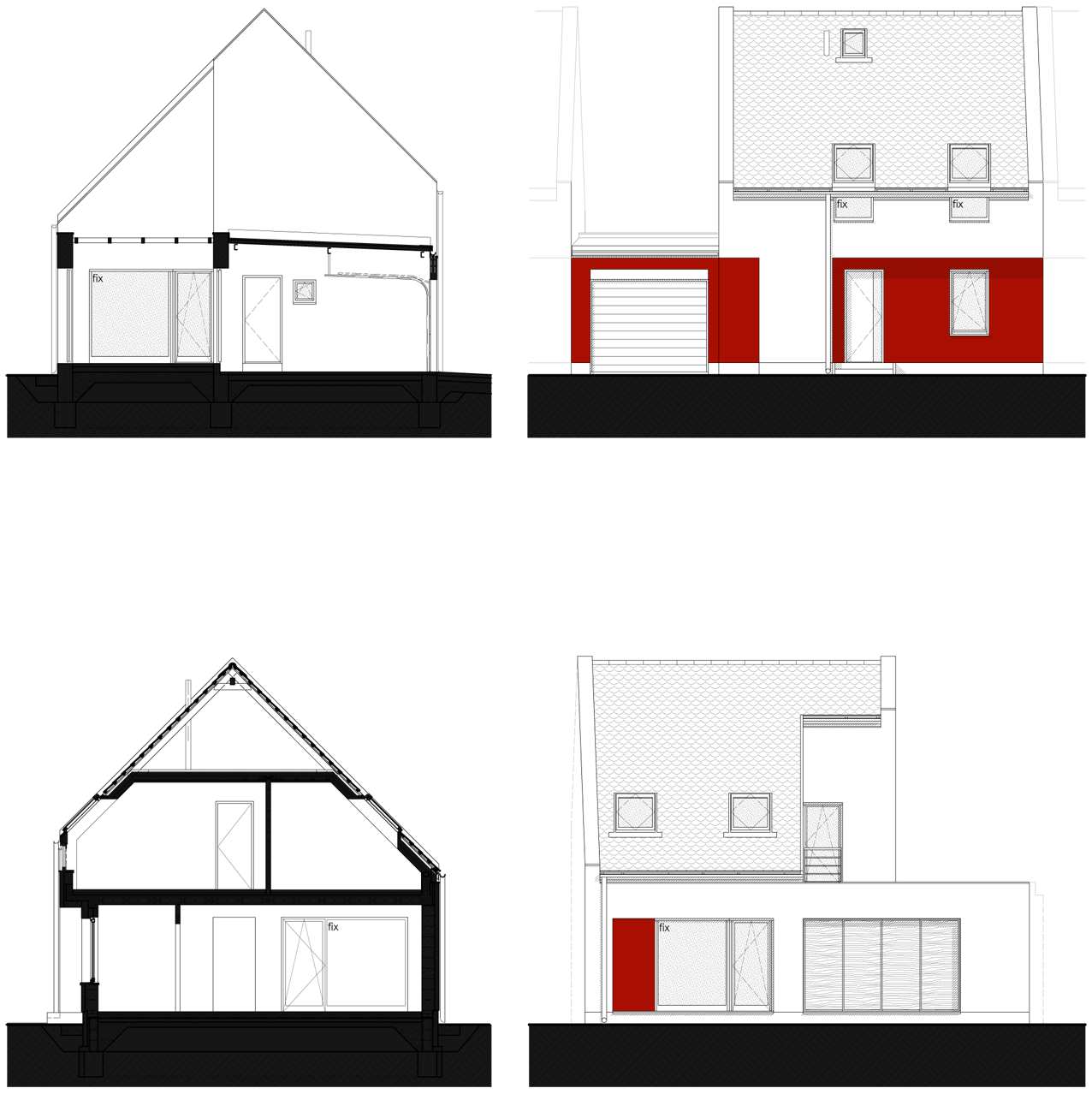 A tervezés során kiemelt figyelmet fordítottam az egyes helyiségek egymáshoz képesti praktikus kapcsolatára, mert olyan lakóterek létrehozása volt a cél, melyek a családi életet a lehető legjobban szolgálják. Az esőtől és széltől védett bejárati ajtón egy földszinti előtérbe jutunk, ahol kényelmesen cipőt lehet cserélni, lekabátolni. Ebből a légtérből nyílik egy flexibilisen használható tér, melyben kertkapcsolatos nappali-étkező, valamint a róla vizuálisan leválasztott konyha. A nappali-étkező szélén lévő közlekedősávon keresztül elérhető előtérből is megközelíthető a garázs, valamint innen vezet fel az emeletre a lépcső, melynek egyik karja alatti tér vendég WC-ként hasznosítható. A lépcsőn egy emeleti közlekedőre jutunk, ahonnan két hálószoba, és egy fürdőszoba nyílik. A nappalihoz egyszerre nyílik egy zárt, fedetlen patiora, és a hátsó kertre.